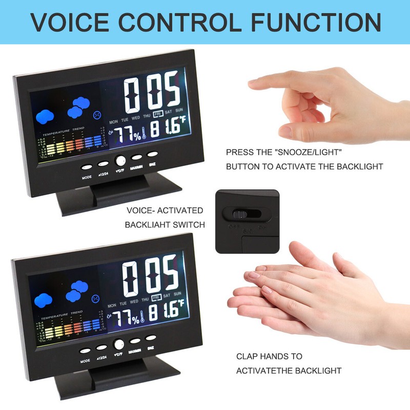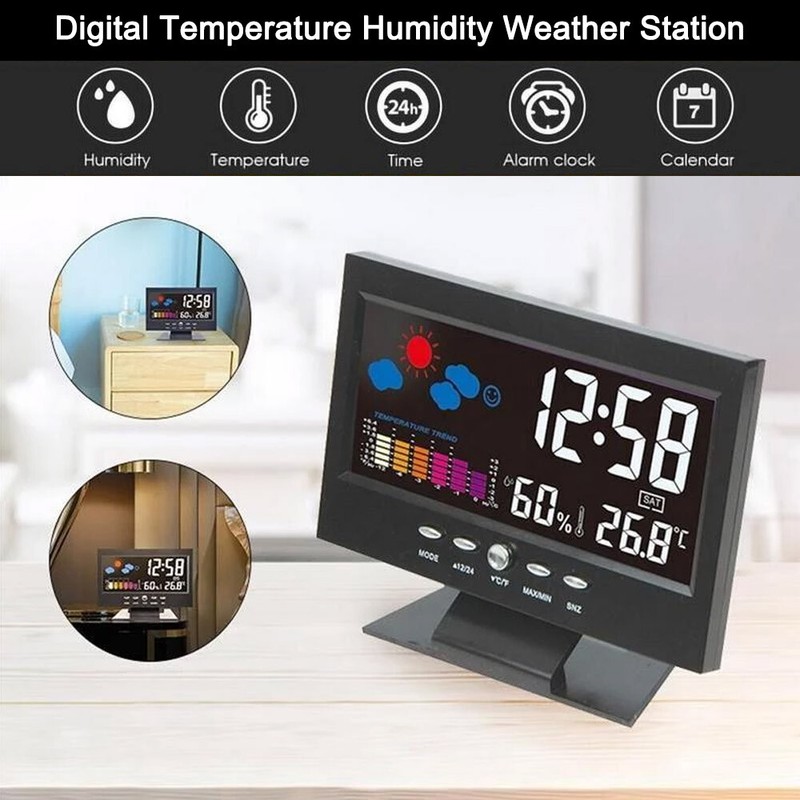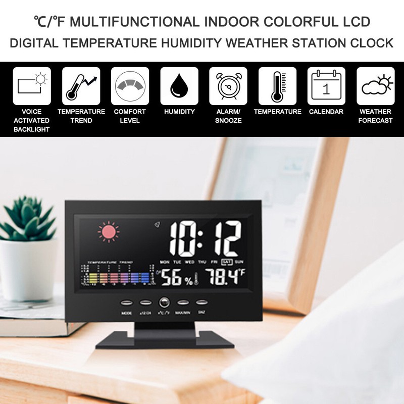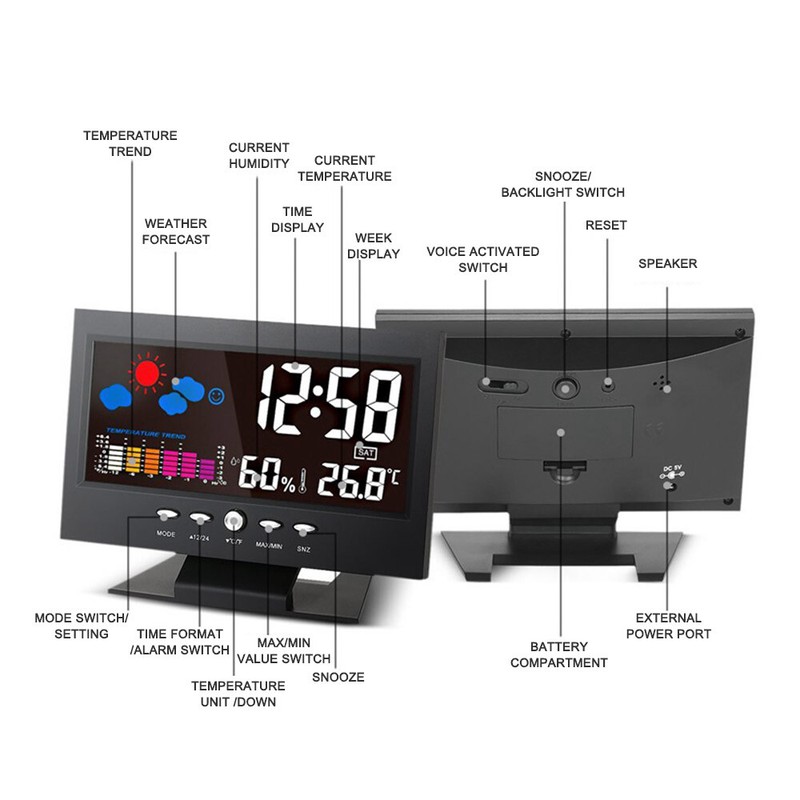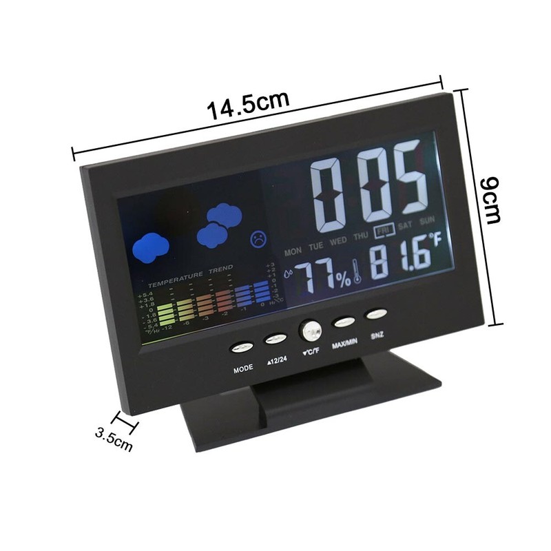 - Features: With alarm, snooze function, weather, comfort level, temperature trend indication, measure temperature and humidity