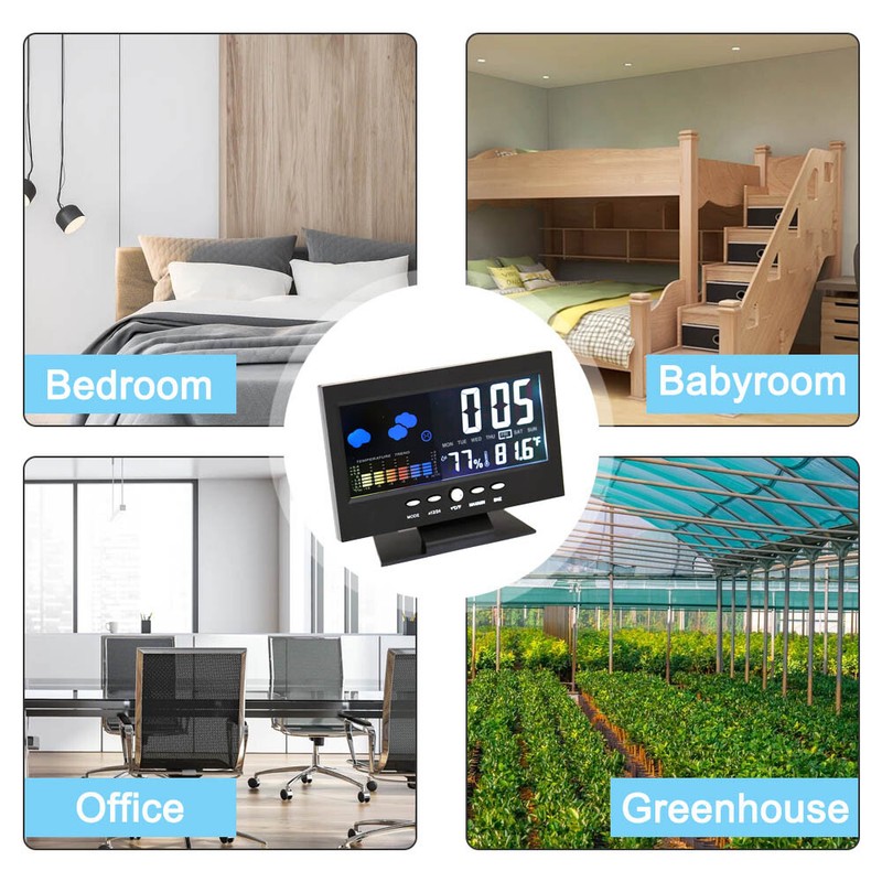 - Display the time in 12/24-hour format with clock features. Set alarms, utilize the snooze function, and observe weather conditions, comfort levels, and temperature trends.